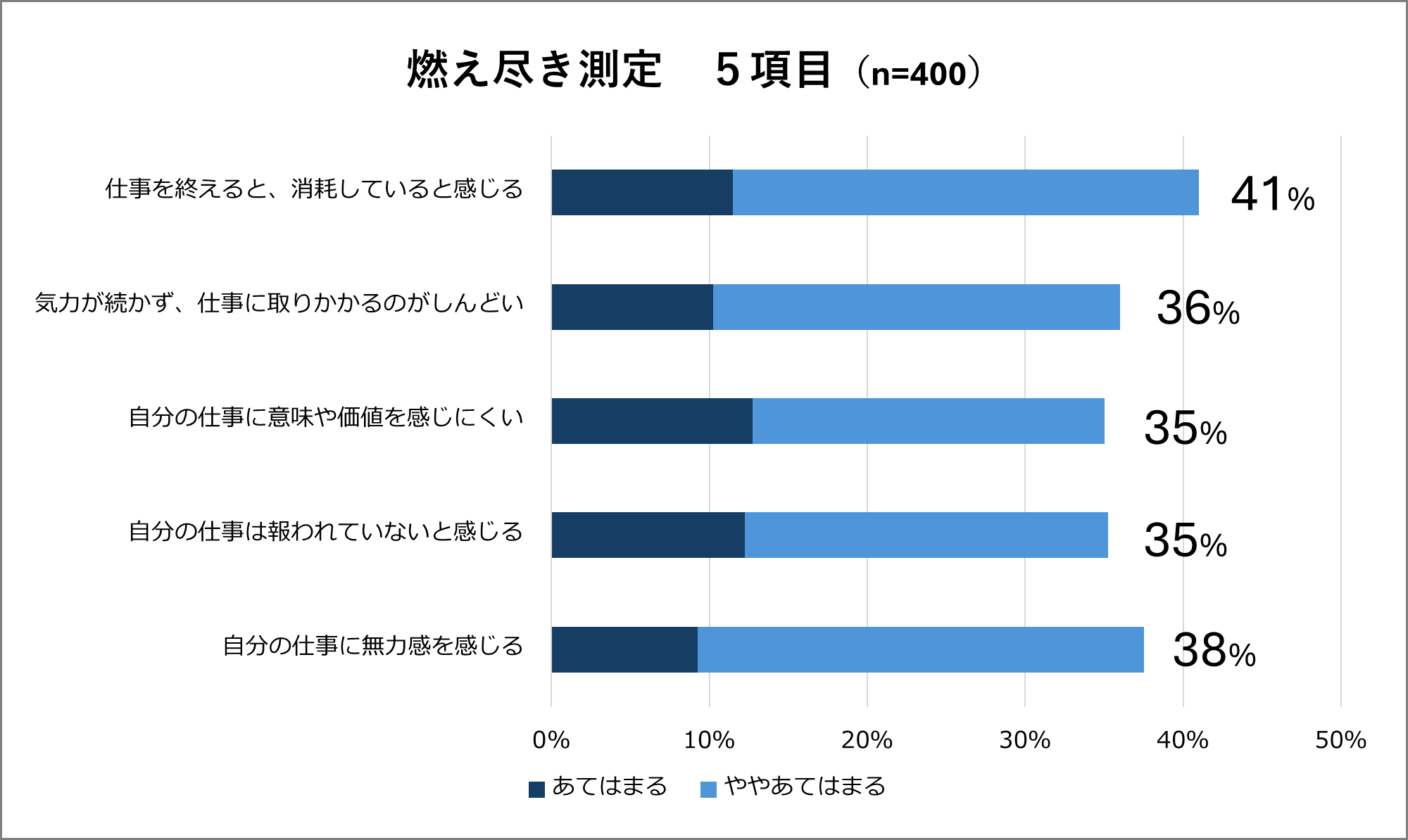 5項目全てにおいて、「あてはまる+ややあてはまる」と回答した割合が35%以上となりました。このことから、3人に1人以上の課長が燃え尽き度が高い状態にあると言えます。