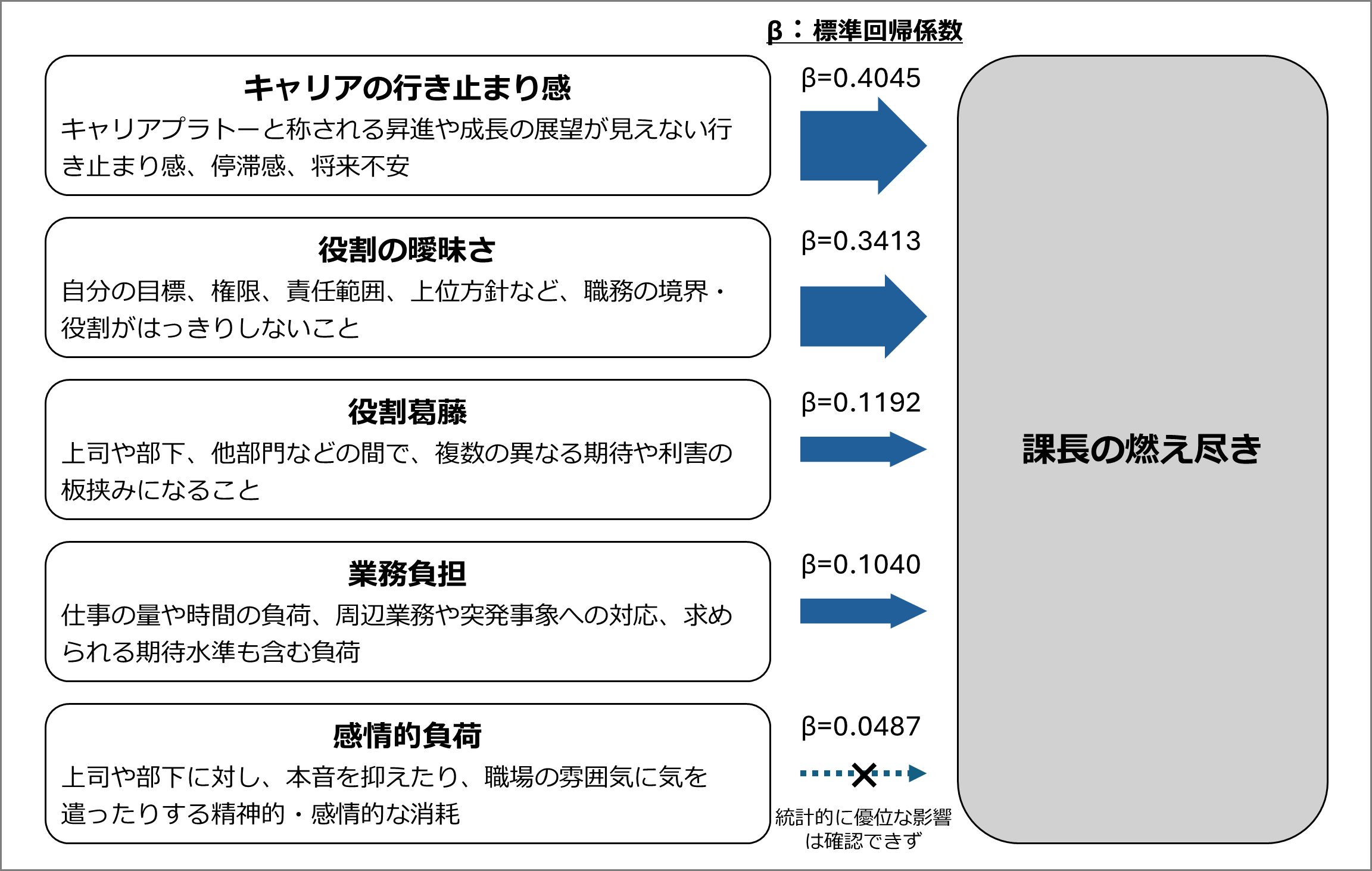 課長の燃え尽き度指数に対する複数の要因候補(注2)について、重回帰分析(注3)を実施した結果、課長の燃え尽きに最も強く結びつく要因は、従来の想定されていた「業務負担」よりも、「キャリアの行き止まり感」と「役割の曖昧さ」が深刻に影響していることが判明しました。